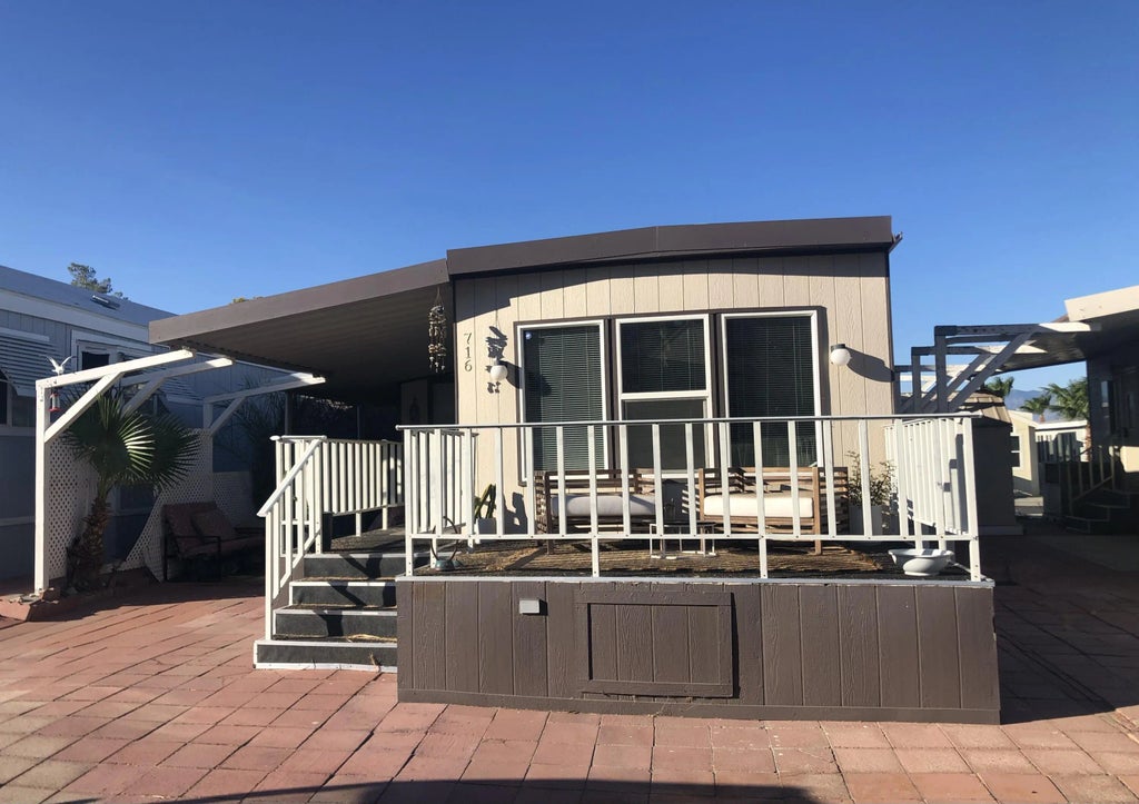 Deck overlooks greenbelt on this charming 1988 Aljo park model.  Covered carport used as patio.