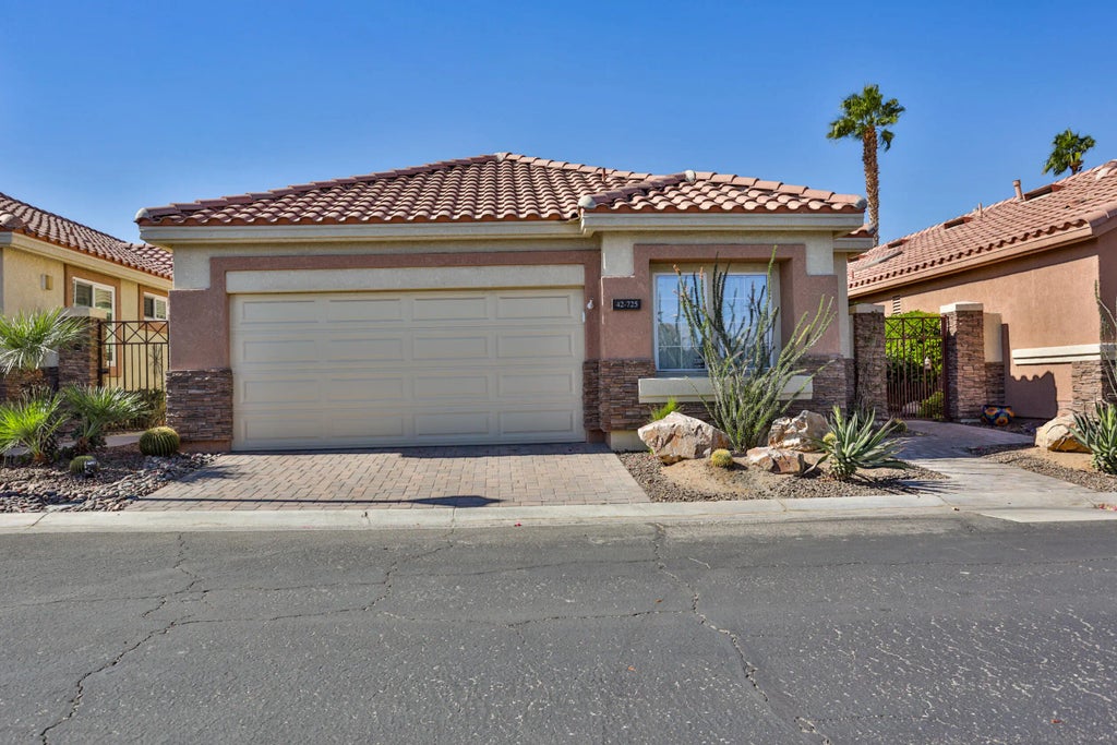 If you've been looking for a place in Oasis CC. This might be it. This detached home is the largest model and one of most desirable models in Oasis. As you approach the paver-lined driveway and walkway, surrounded by lush landscaping and the gentle sound of the charming fountain, creating a welcoming ambiance that sets the mood for the home. It's a three-bedroom, two-bath condo that is light, bright, and spacious. Inside, you'll find a newly updated kitchen featuring a gas cooktop; a true advantage for those who love to cook. New quartz countertops with new complementary backsplash. Both bathrooms have been beautifully updated to include a spa-like atmosphere. The master bath even has a luxurious bathtub for unwinding as well as a shower. All 3 bedrooms offer generous closet space, and there's a dedicated laundry area inside the house for added convenience. Out back you have the sweeping views of the lake, fountains, fairway, and majestic mountains. The outdoor patio is perfect for entertaining, with new alumawood covering, complete with lighting and ceiling fans—an ideal spot to relax and watch the golfers during the day and dinner and cocktails with friends at night. The garage has a split unit and a dedicated space for a golf cart, making it both functional and comfortable. Enjoy the benefits of Oasis CC lifestyle with access to golf, pickleball, tennis, and a social calendar filled with community events. Don't miss this opportunity to own a piece of paradise.