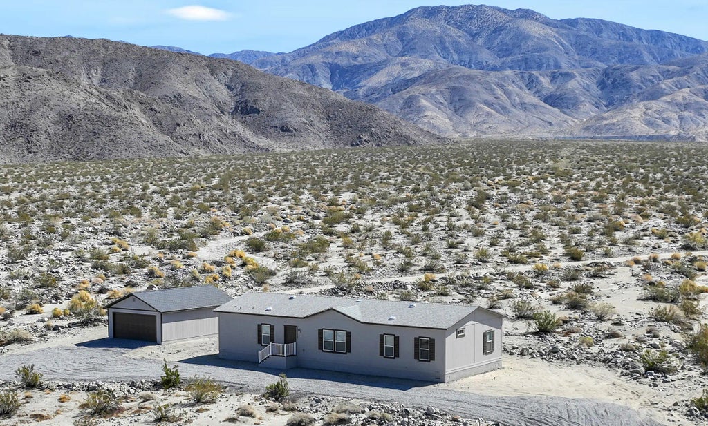New home on just under 5 acres with an oversized (20 X 30) two car garage and workshop. This new home is on a permanent foundation and includes kitchen appliances. This area is part of the IID (Imperial Irrigation District - electric company) which will save you money on your electric bills. This unit is 4 bedrooms, 2 baths with a den and 1800 square feet of living space. The views from this home are nothing less than spectacular as you look out to see Mount San Jacinto, and San Gorgonio , along with the little San Bernardino mountains along the side and east. This home gives you the feel of wide open spaces as you enjoy peace and quiet all around you. EZ to show!