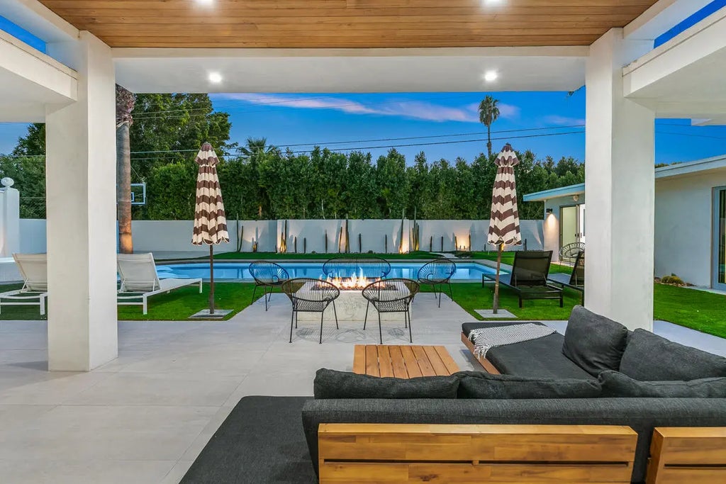 Welcome to your dream getaway in Palm Desert! This stunning contemporary modern pool home is available for flexible month-to-month leasing and offers the perfect blend of luxury, space, and entertainment. With 4 spacious bedrooms, 4 full bathrooms, and accommodations for up to 11 guests, this is the ideal desert escape for families, groups, or corporate retreats.Step inside to an open, light-filled floorplan featuring modern finishes and a bonus room complete with a full bar and stylish sitting area—perfect for entertaining or relaxing in style. Outside, the resort-style backyard is a true showstopper, boasting a massive covered patio with wood-planked ceiling, fully equipped outdoor kitchen, and a sparkling pool and spa with a generous tanning shelf for lounging under the sun.