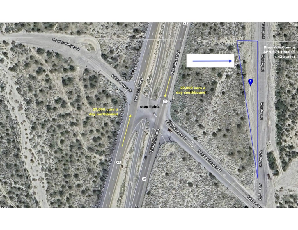 Located just off but visible from highway 62, this property is at the traffic lights where around 27,000 cars a day travel north on highway 62 and many more cars pass by on Indian Canyon. The possibilities are endless for a food truck operation or other uses could take advantage of the thousands of people a day who pass by the property. The uses for the property would need to be investigated and approved by the county of Riverside and a buyer is advised to contact county planning for specific information. This one is a steal at the price. .42 Acres, 18295 square feet.