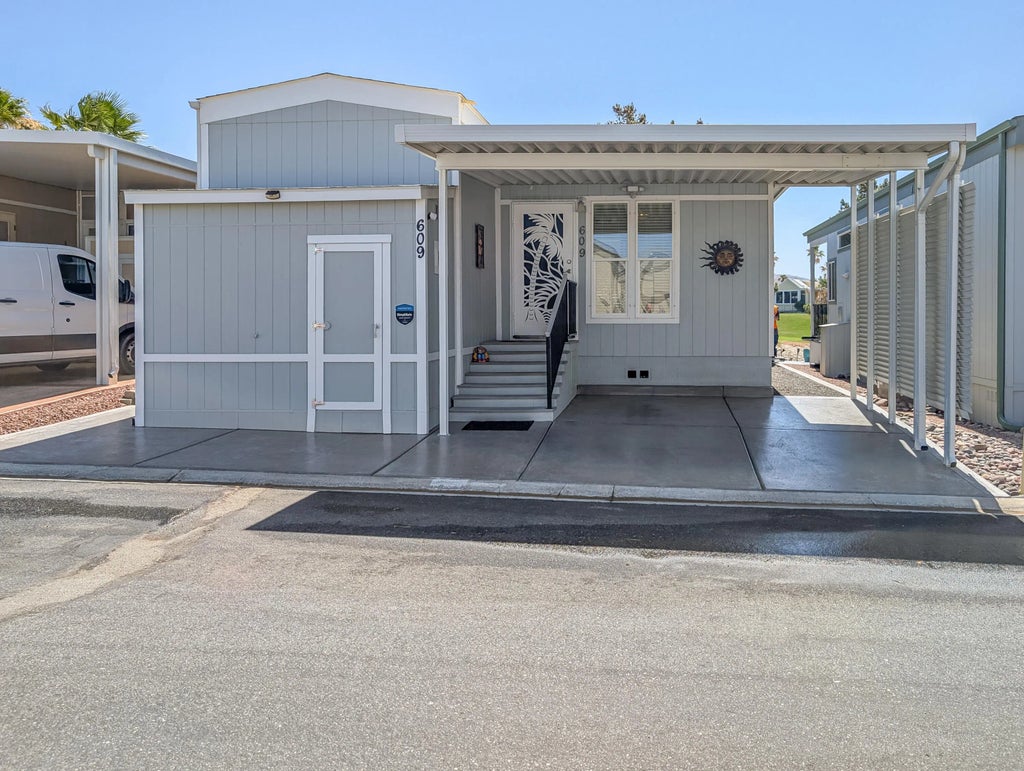 This highly sought-after home offers unparalleled views from both inside and outside of the home, located by the esteemed 5th/6th hole of the golf course. Meticulously maintained, this approximately 650 sq. ft., one-bedroom (king-size), one-bathroom 2013 Cavco Desert Rose Park Model showcases pride in ownership. The home features modern appliances including a Bosch dishwasher, stacked washer/dryer, an open floor plan, a white-coated roof for enhanced efficiency, half steps at the entry for easier access, mature irrigated landscaping and a stick built and well-constructed California room overlooking the beautiful surroundings. The interior boasts high-volume ceilings throughout, contributing to a spacious and airy atmosphere. Caliente Springs is a premier 55+ luxury resort with amenities that make you feel like a VIP, including a mineral-fed hot spring pool and spas, a 9-hole golf course, water ball, water aerobics classes, yoga, 8 pickleball courts, tennis courts, and much more in this lively and active community. The lot is not owned; space rent is $950.