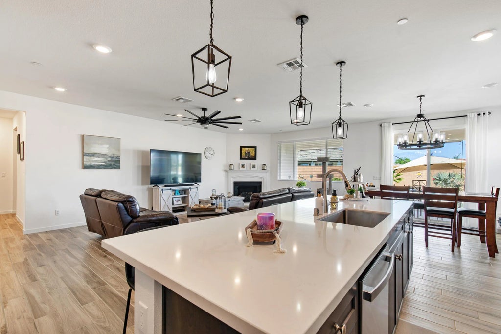 Inside boasts an open floor plan with an oversized kitchen island, quartz countertops, upgraded backsplash, dual ovens, stainless steel appliances, a walk in pantry, and plenty of storage. This home features upgraded wood plank tile flooring, a fireplace, and upgraded ceiling fans and light fixtures that are sure to impress. In addition to the 4 bedrooms, there is a ''flex'' room that is perfect for the home office, workout area, kids playroom, or anything you can imagine! Located within the lower cost IID utility district, this home also includes paid solar and a tankless water heater to keep utilities LOW and the already low HOA includes cable AND internet! A 3 car garage completes this home - what more can you ask for?!