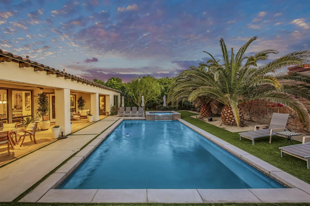 Designed for relaxation and entertainment, this desert oasis offers 5 bedrooms, 4.5 bathrooms, and 9 total beds—perfect for large groups. Guests rave about the resort-style backyard, complete with a sparkling pool, oversized hot tub, putting green, and custom-built outdoor kitchen with a fireplace and firepit—creating the ultimate indoor-outdoor experience.