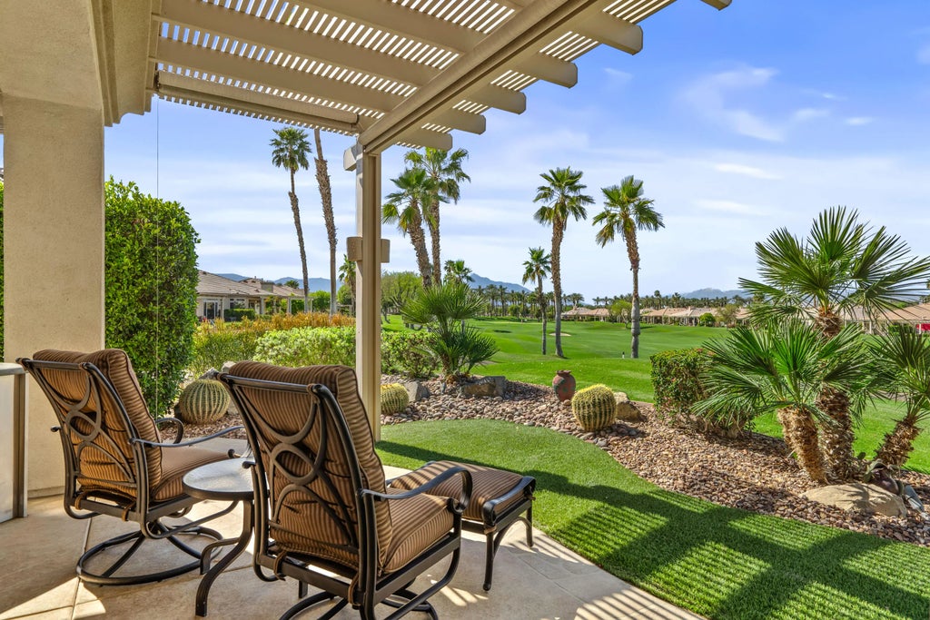 BEAUTIFUL PANORAMIC Fairway & Mountain views from this elevated site on the 15th fairway in Heritage Palms. Featuring 3 bedrooms, 2 1/2 baths, a large open design with fireplace in the family room, beautiful slab granite kitchen counters with cherry wood cabinetry including the optional buffet, stainless/black appliances, and upgraded picture windows replacements of the entire rear/view side of the home. The spacious primary suite with optional bay window features a large bathroom with soaking tub, separate shower, dual vanities, walk-in closet and french door to your covered rear patio with flagstone style overlay. Motorized drop down shades, brick paver walkway, drought tolerant desert landscaping, artificial turf and plenty of room for entertaining your friends & family or simply taking in the spectacular views. Bedroom #2 not shown in pictures. ( please refer to the floor plan shown). Additional upgrades include brick paver driveway, golf cart parking area, hanging racks, garage A/C unit, both of the homes A/C units and furnaces have also been replaced. Heritage Palms is a premier adult community featuring an 18 hole championship golf course, indoor & outdoor pools, pickleball & tennis courts, fitness center, billiards room, card rooms, grill room, social clubs and more.