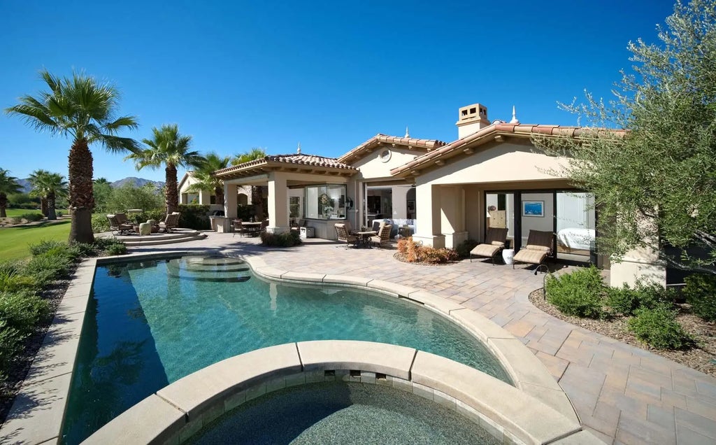 Situated along the 10th fairway of Toscana's North Course, this beautifully appointed Italianate-style home offers sweeping, unobstructed views of the golf course and surrounding mountains—with not another home in sight. Designed for elegant desert living, the residence blends classic European architecture with modern sophistication. The expansive great room features soaring ceilings, a stone fireplace, and dual Fleetwood pocket sliders that seamlessly connect the interior to the outdoor living spaces, filling the home with natural light and showcasing the picturesque landscape. At the heart of the home, the gourmet kitchen is equipped with Sub-Zero and Wolf appliances, custom cabinetry, and ample counter space. A convenient breakfast bar provides the perfect spot for casual dining or morning coffee. The primary suite offers a tranquil retreat with sweeping golf course views and direct patio access. The en-suite bath features a spacious walk-in shower, dual vanities, and a large walk-in closet, creating an atmosphere of refined comfort. A private guest suite, a dedicated office, and a detached casita with its own en-suite bath provide flexible space for hosting family and friends. Outside, the expansive patio invites alfresco entertaining with a built-in BBQ and multiple lounging areas surrounded by lush landscaping. Additional features include a mini split-cooled garage, ideal for climate-controlled storage or hobbies. This exceptional home is a true retreat—where timeless elegance meets the best of desert living in the heart of Toscana Country Club.