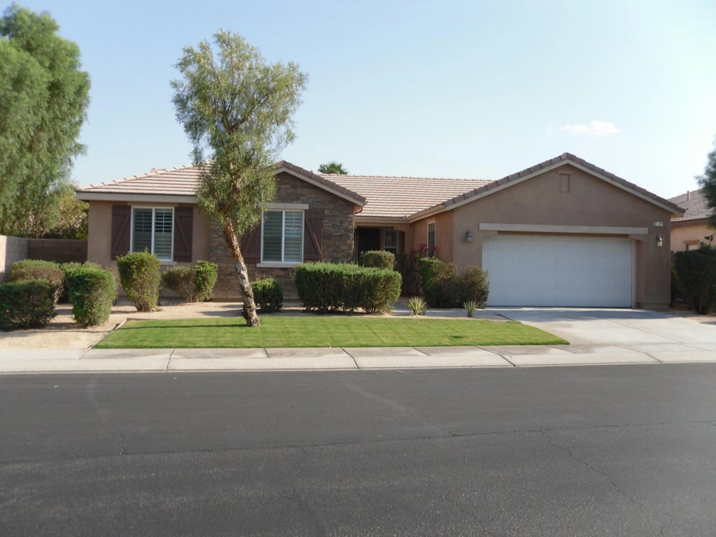 Welcome to 81917 Villa Palazzo located in the desirable gated community of Palazzo where the HOA's are low. As you enter the gate to the community this is the first home inside the gate situated next to a beautiful greenbelt. Entering the home you will find the newly tiled Living Room which then leads to the open concept Dining Room and Kitchen with a Den/ Library/Office space, as well, with a full wall of Library style bookcases. There is recessed lighting throughout. The stylish contemporary kitchen features granite countertops, stainless steel appliances with an additional side by side refrigerator in the garage, ample cabinetry for storage, walk-in pantry, and a large island perfect for entertaining family and friends. There are new ceiling fans as well as plantation style shutters in all rooms. The Primary Bedroom has a large bathroom with double sink vanity, separate shower and soaking tub and a walk in closet. The half bath has been upgraded with all new fixtures including vanity, lighting and toilet. Sliding glass door leads to a covered patio for additional space, expanding your entertaining options. In the backyard you will find mature landscaping for privacy and a matching storage shed. And for your comfort there is also an A/C unit for the garage space. This home has been well maintained and is ready for you to enjoy.