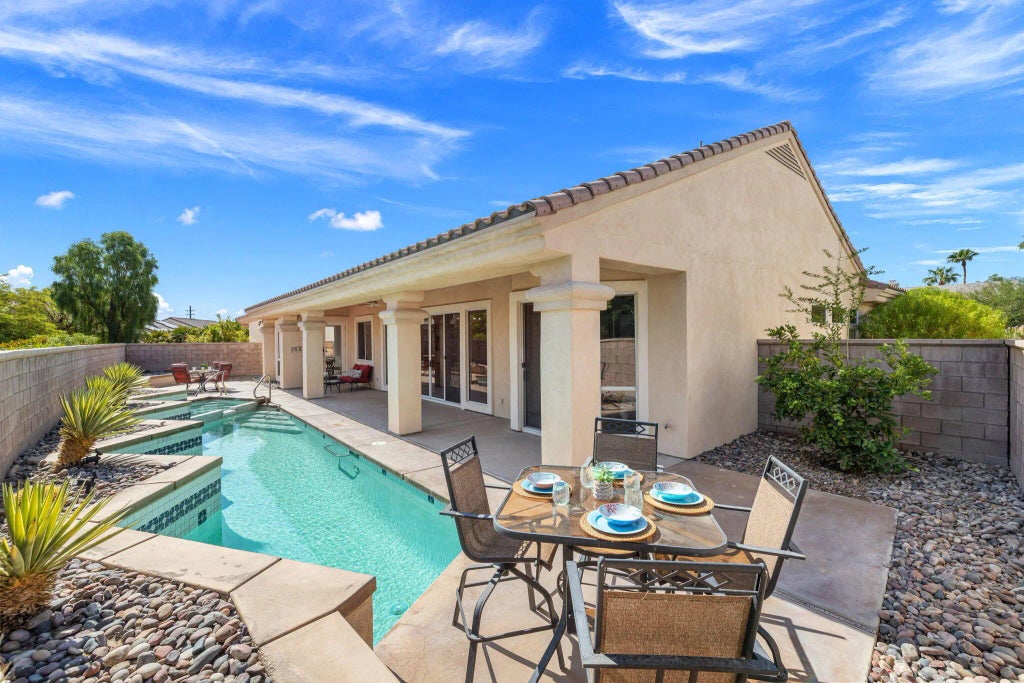 Located in the best 55+ community in the valley, Sun City Palm Desert, the Monaco is one of the most popular models. With 3 bedrooms, 3 baths, a formal living/dining room, and a family room open to the kitchen. It is perfect for entertaining. As you enter the tropical gated courtyard and into the home, you are awe-inspired by the sparkling lap pool/spa, and the extended north-facing backyard patio, perfect for afternoon BBQs. The upgraded kitchen has stainless appliances, white cabinets, a skylight, and it opens to the family room and kitchenette area. The master bedroom views the pool, and the ensuite bathroom has a double vanity, a private toilet room, a walk-in closet, a walk-in shower, and a soaking tub. The extended guest bedroom is huge, with its own ensuite bathroom, and can be used as an office, hobby room, or private guest bedroom. The extended den/bedroom has a full bathroom attached, and a beautiful built-in double office desk, and plenty of shelving. The laundry room has storage of cabinets, an extra fridge, and the washer and dryer are included. The extended garage has a golf cart garage, storage cabinets, and a NEWER HVAC unit. There are motorized shades in the living room, dining room and front door. This home is the perfect year-round retreat.