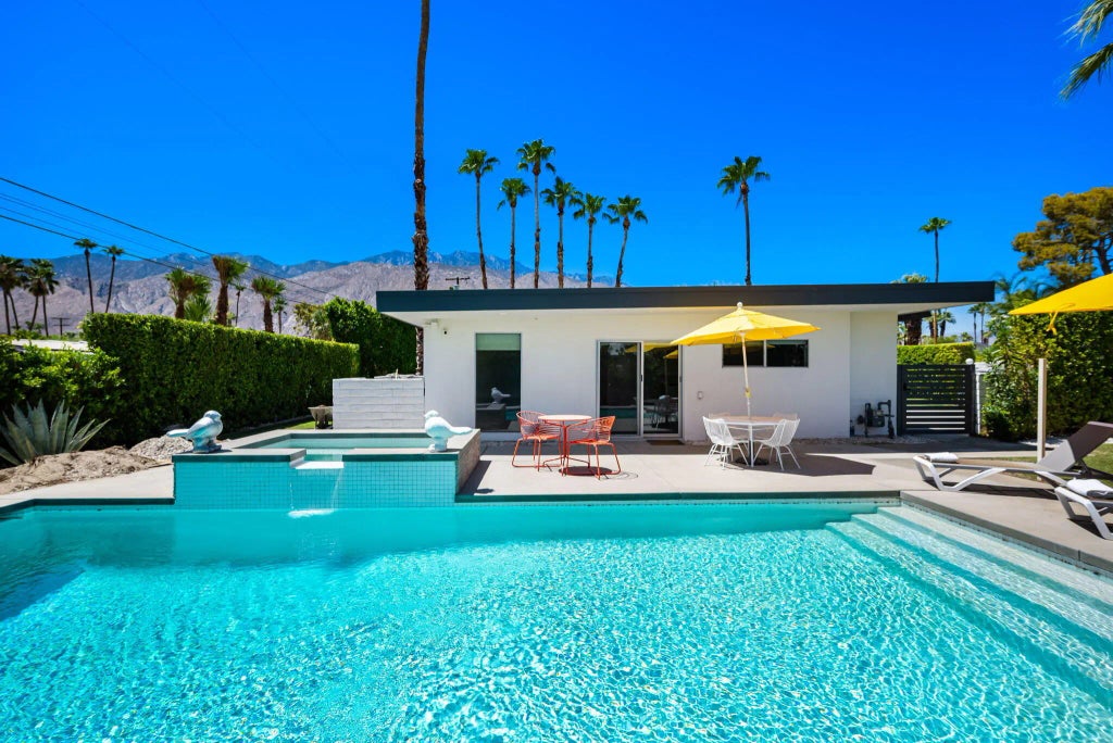 Renovated Mid-Century in Sunrise Park - Central Palm Springs. Experience the perfect blend of iconic mid-century architecture and today's modern luxuries in this fully renovated Sunrise Park stunner. Behind lush privacy hedges and a gated drive, this home offers style, comfort, and sophistication just minutes from downtown Palm Springs. Crisp, clean lines and open, flowing living spaces highlight the glamour of the era, while sliding doors blur the lines between indoors and out. A brick fireplace anchors the living area, perfectly creating an ambiance. The updated kitchen is a contemporary showpiece, featuring stainless steel appliances, striking countertops, designer backsplash, and a peninsula breakfast bar that opens to the family room—ideal for entertaining. Newer tile flooring throughout, remodeled baths, updated fixtures, and modern lighting enhance the home's fresh, cohesive design. Attractive floorplan with primary suite away from other bedrooms. Dining room for formal meals and gatherings. Step outside to your own private oasis. Beautifully landscaped grounds balance low-maintenance desert plantings with lush greenery. The large patio provides multiple seating and dining areas, all oriented toward dramatic mountain vistas. A sparkling pool and spa invite sunny afternoons, starlit evenings, and effortless gatherings with friends and family. This home is more than a residence—it's a lifestyle. Lounge by the pool, entertain in style, or take a quick jaunt into town for dining, shopping, and events. With its unbeatable location, move-in-ready renovations, and undeniable Palm Springs charm, this is the quintessential desert retreat you've been waiting for.