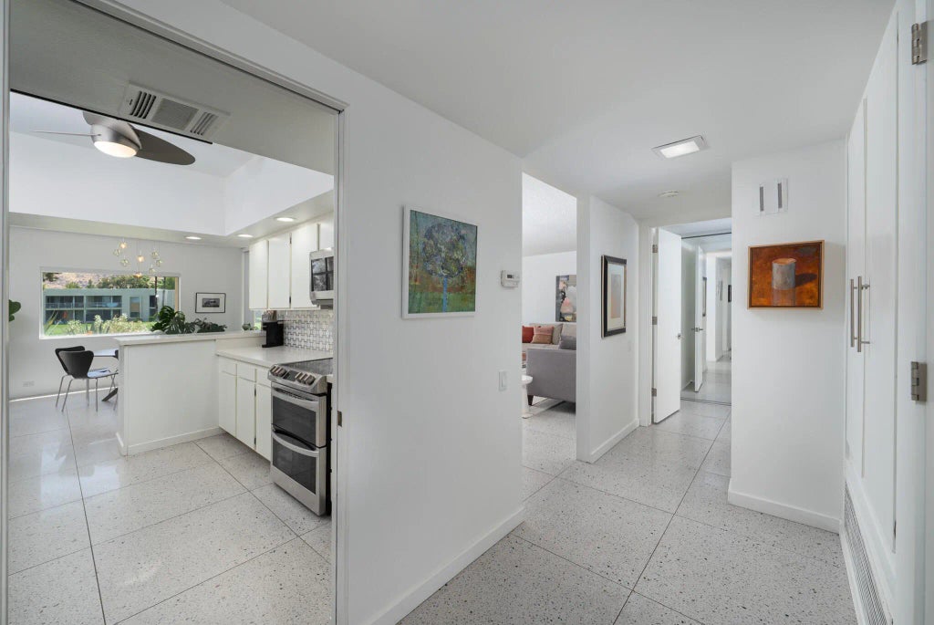 Discover timeless design and resort-style living in this spacious mid-century modern one-bedroom, two-bathroom condominium, a rare ground-floor residence created by renowned architect Richard Harrison. Perfectly positioned on the 13th fairway of the Ted Robinson-designed executive golf course—where President Eisenhower famously scored his only hole-in-one—this home blends architectural pedigree with a rich history. Located within the guard gated grounds of Seven Lakes Golf & Country Club, this south facing unit offer views of the iconic Bob Hope estate. Inside, the expansive floor plan showcases clean mid-century lines, terrazzo tile flooring throughout, abundant natural light, and versatile living and dining spaces. The generously sized primary suite is complemented by two full bathrooms, offering both comfort and convenience. Step outside to your private rear courtyard with its own separate entrance, ideal for entertaining, dining al fresco, or enjoying tranquil mornings overlooking the lush surroundings. A private one-car garage with additional storage provides practicality to match the style. Whether you're a golf enthusiast, a lover of iconic architecture, or simply seeking a distinctive retreat, this home offers a unique opportunity to own a piece of history in an unparalleled setting.
