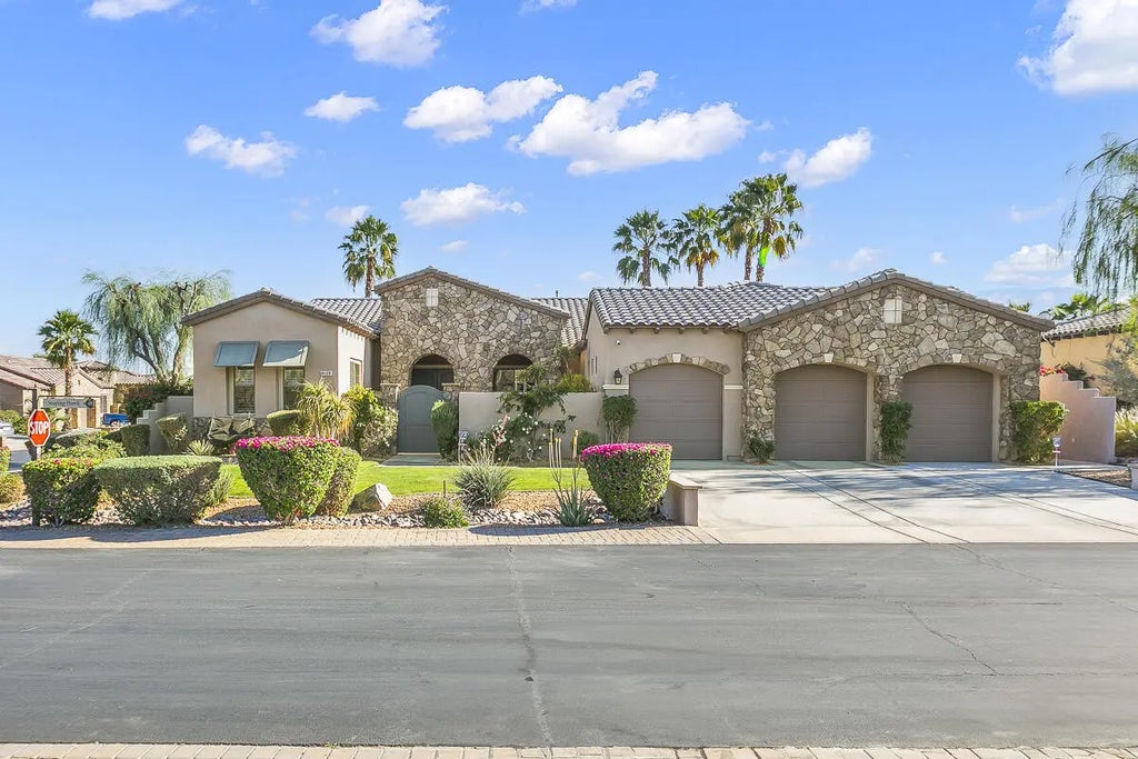Tuscan-inspired resort home in Montage Santa Rosa, an STR-friendly gated community just minutes from world-class events. A gated courtyard opens to a grand foyer with soaring vaulted ceilings and statement chandeliers. The 4BD/3.5BA layout (plus den/office) balances elegance and function: formal dining with butler's pantry, and a chef's kitchen with double ovens, granite counters, walk-in pantry, and a generous breakfast nook flowing to a light-filled family room with 9' ceilings. Quality finishes include appliances/fixtures from Pacific Sales and tile/quartz selections from Arizona Tile. The south-facing backyard is an entertainer's dream with saltwater PebbleTec pool/spa and a large covered patio. Retreat-style primary suite offers two oversized walk-in closets, soaking tub, and walk-in shower. Major upgrades: dual Rheem 5-ton 16 SEER ACs & furnaces (2022), water heater (2024), pool heater/pump/control system (2017). Three-car garage with potential to convert one bay to an attached casita for added flexibility and income potential (buyer to verify). A compelling option for full-time living, a vacation retreat, or a high-performing STR.