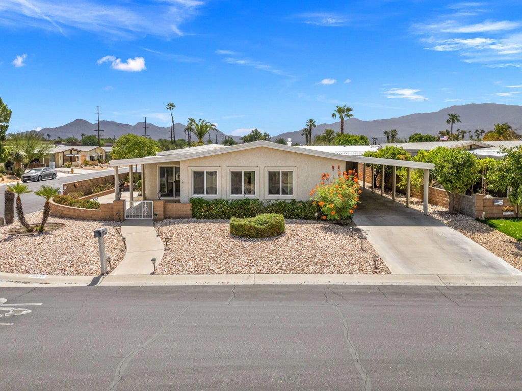 This 1,850 sq. ft. 2 bedroom, 2 bathroom home is truly one of the finest in Palm Desert Greens Country Club, showcasing upgrades throughout including light tones, textured walls, a spacious living room, separate dining area, large bar with its own sink, and an updated kitchen with beautiful quartz countertops. The home also offers a separate laundry room with washer and dryer plus direct access to the parking area. All windows and sliding doors have been replaced, and the pleasant outdoor space features both a tiled patio bar and private lounging areas. The spacious master suite includes a sitting area and mirrored his-and-hers closets, while the large corner lot provides exceptional privacy, two separate covered parking areas, and a golf cart enclosure. Ready for the new owner's final touches, this home offers a fantastic opportunity in one of the most popular 55+ active communities, where you OWN the land and enjoy a low $400 monthly HOA fee that includes 24/7 guard-gated security, cable TV, internet, trash service, FREE golf, and more—making it one of the very best values in the valley! Sold as is