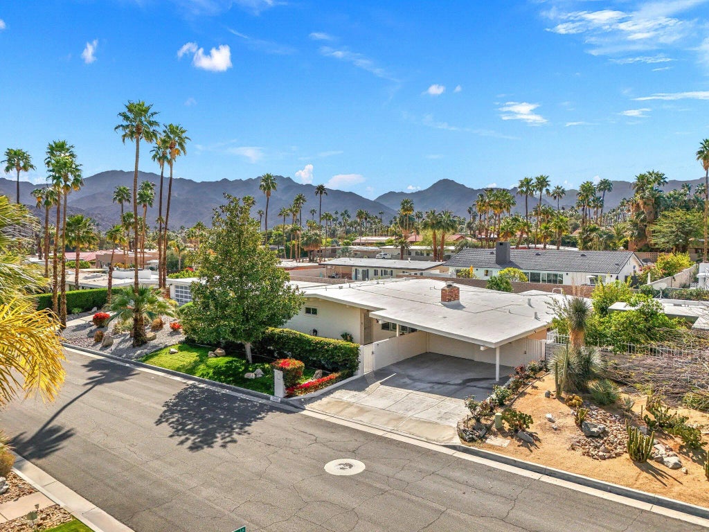 Nestled in south Palm Desert's premier, historic Silver spur neighborhood, this ultra-private mid-century retreat features timeless architecture and character, even boasting a massive casita. Enter through the gated courtyard to the main residence, offering 2 generously sized bedrooms, 2 updated baths, and an open, inviting floor plan. Beautiful wood-beamed ceilings and travertine flooring run throughout, creating warmth and cohesion. The casita mirrors the home's roofline and finishes with a built-in entertainment center, walk-in closet, and updated bath. It's an ideal space for guests, extended family, or a private work studio. Designed for effortless indoor-outdoor living, the lush backyard features a large covered patio for entertaining, a built-in barbeque, and a relaxing spa. Chase the sun, soak in dramatic mountain views, and enjoy the quiet serenity that defines this neighborhood. Lovingly maintained and truly move-in ready, this home sits just five doors from Ironwood Park, walking distance to The Living Desert, and moments from El Paseo's world-class dining, shopping, and galleries.