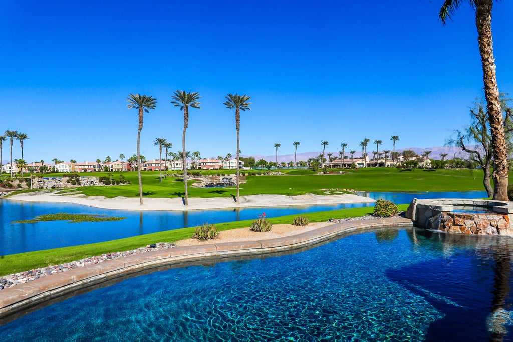 Premium private View lot!! Breath taking, Majestic mountain views, perched on top of a hill overlooking the 18th. hole, lake and serene waterfalls! This home is Immaculate in every sense of the word! Chiselled edge, Versaille pattern travertine flooring and high ceilings create the open airy feeling to bring the beauty of the view into this spectacular home. Living area with fireplace, Kitchen & dining area with wet bar are all open offering ease to entertain or just sit back and relax to take in the view. Vast side and rear yards are accessible by sliding glass doors from kitchen and den. Garage equipped with mini split AC unit. The resort like expansive patio with out door cooking area, pool & spa & fire pit are elevated overlooking lake, waterfalls to relax and enjoy the beauty of nature. Patio has misters for year round enjoyment. The guest suites are ensuites each with their own bathroom and located opposite side of the home for complete guest privacy. The Primary suite is located at the rear of the home for easy access to pool & spa and large windows to awake to the amazing views.