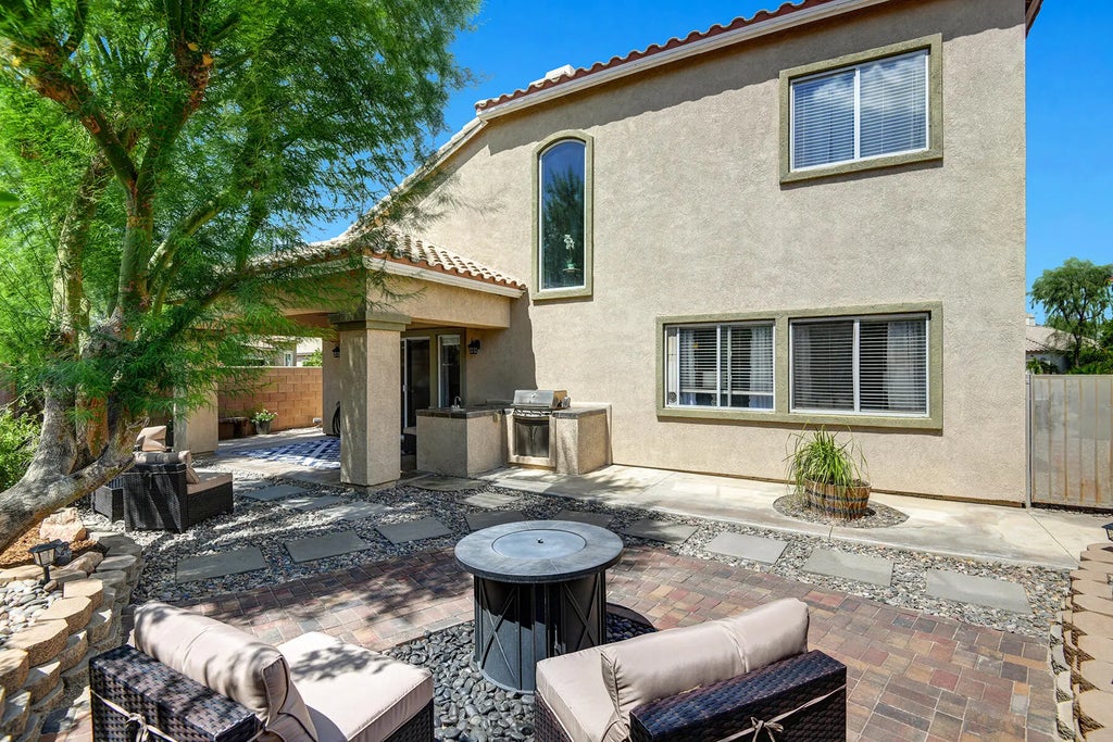 Located in one of Indio's best golf communities, with excellent proximity to La Quinta and Highway 111, this relaxing two-story home on a corner lot boasts 3 bedrooms, 3 baths, with upgraded front and back yard areas. The expansive downstairs includes a half bath, powder room, along with a primary bedroom that offers two spacious walk-in closets, and a bathroom with a standing shower and hot tub. There's ample space and storage throughout the kitchen with gas range, and double ovens. The light and bright living room with fireplace makes for an inviting area to entertain friends and family, only made more comforting with the high ceilings & natural lighting. Upstairs you will find the two well maintained guest bedrooms, with a shared Jack & Jill bathroom, and an office space on the loft. The garage has a Tesla charging station installed as well. Walking distance to the gym and pool around the corner. The 24-hour guard-gated entrance provides welcome peace of mind. Located within the highly regarded Desert Sands Unified School District, this home speaks to families seeking not only a gracious family home but also an exceptional education. Embrace a life where every facet of comfort, leisure, and convenience intertwine to provide a wonderful life experience. HOA includes exterior landscape maintenance, TV, Internet, gym and pool access.