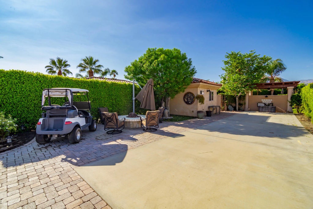 Welcome to Motorcoach Country Club, the desert's premier Class A motorcoach resort, offering world-class amenities, 80 acres of lakes and waterways, a private executive golf course, tennis, pickleball, and a full-service clubhouse with fine dining and bar. Owners also enjoy a vibrant social calendar and resort lifestyle unmatched in the Coachella Valley. This Outdoor Oasis is a beautifully developed privacy lot along the quiet South wall with no afternoon sun in your coach windshield. The property features an expanded paver patio with golf cart parking and synthetic turf, a large pool and spa with waterfall, and a fully enclosed backyard retreat with privacy wall and gate. Outdoor living includes a wooden pergola with custom shades, built-in entertainment center with lighting and overhead fan, and a spacious BBQ island and bar complete with warming drawer, burners, new Blaze refrigerator, new Blaze ice maker, and plenty of storage. A large custom gas fire pit with cantilever umbrella provides the perfect evening gathering spot. The air-conditioned casita offers a new queen Murphy bed, tiled countertops, kitchen sink, abundant cabinetry, and a ¾ bath with tiled shower—ideal for guests or additional living space. The air-conditioned casita offers a queen Murphy bed, tiled countertops, kitchen sink, abundant cabinetry, and a ¾ bath with tiled shower—ideal for guests or extra living space. Sellers will include the full $2,020 Food & Beverage Assessment for the 2025-2026 season. *Motorcoach Country Club exclusively accommodates Class A motorhomes from 30' to 45'. Due to zoning, on-site properties are not considered dwellings, and overnight stays inside them are not allowed. MCC's annual Food & Beverage minimum is $2,080.
