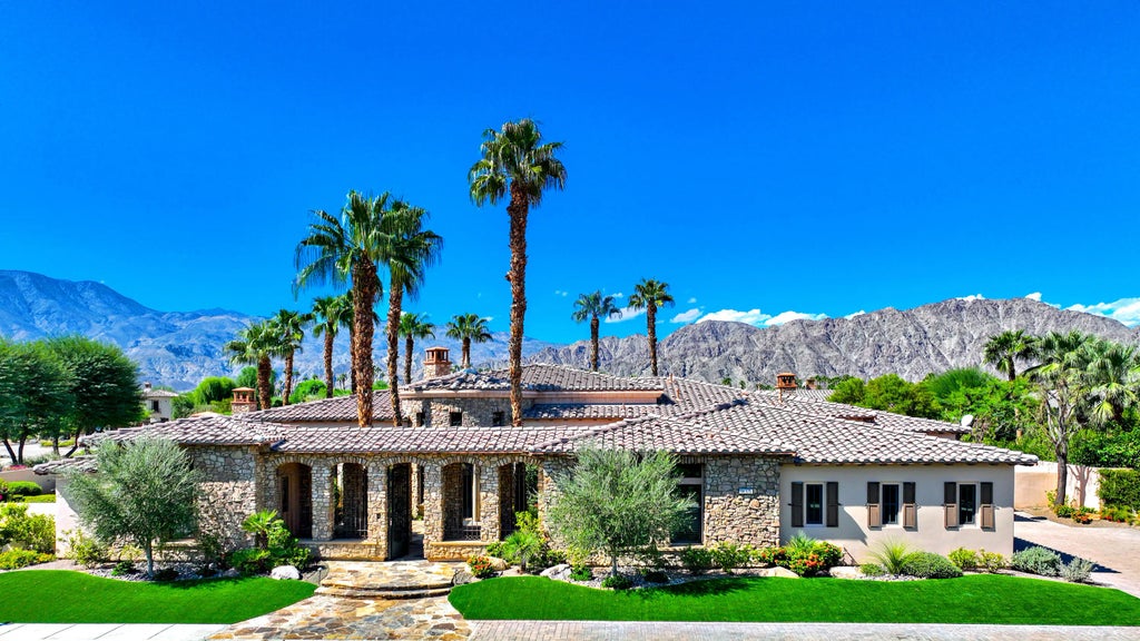 Griffin Ranch, and the Sevilla floor plan was part of the Merv Griffin dream, stately homes, with character, amazing curb appeal, large home sites, mountain views with dynamic sunsets. When touring this previous model home you'll notice the quality throughout, from wood baseboards & doors to the solid wood beams, double Kitchen Islands & complete wolf appliance package, nothing fake here, this is the real deal. Enter the spacious living room, you're eyes will be drawn to the one of kind fireplace with full brick wainscoting. Stroll through the 10' custom stackable doors to the fresh water pool , spa & waterfall designed by one of the leading builders in the Coachella Valley. Moving back indoors, pass by the sunken bar with under counter refrigerator to the inviting morning room, amazing cooks kitchen with space for all to participate and a family size dining room where no one will be left out. This space is so well designed, gathering together is great, and finding space for yourself just as important. The southwest facing views of the Santa Rosa Mountain are magical whether enjoying morning coffee or a chilled glass of wine at night. This is a corner lot so the privacy is special and the location near the clubhouse is super desirable. Griffin Ranch clubhouse & sports amenities are worth bragging about with eight pickleball courts, two tennis courts, a palates room with four reformers, separate fitness area, Jr Olympic size pool with dedicated swim lanes, hot tub, cabana's, 9 hole putting green, two bocce courts, event space & wow does Griffin Ranch HOA through several amazing parties throughout the season. If you are looking for ''Grand'' you found it, This home is being offered furnished, so bring your suitcase and get ready for a marvelous 2025/2026 Season at Griffin Ranch.