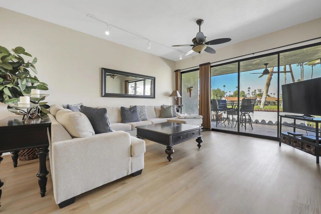 Location! Location! Location! This 2 Bedrroom condo has an amazing location. Located close to the front entry, Omni Resort and Clubhouse, it is at the end of a private cul-de-sac with the pool and spa directly across from the condo. A private courtyard leads to the double glass door entry. An opan floor plan has the the wall from the kitchen to the living area creating and very open flow. The kitchen features granite slab counters, recessed lighting and stainless steel appliances. The BEST part is the expansive double fairway view of both the 9th fairways or the South and West Courses with the Mountains and Clubhouse in the backfrop.