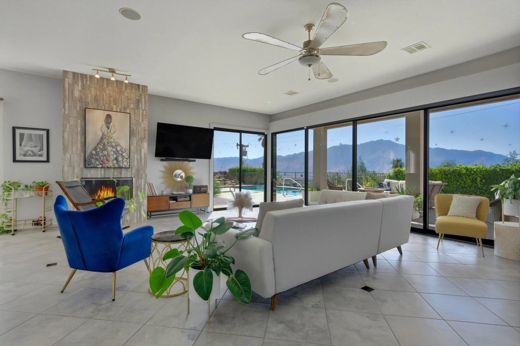 Million Dollar Mountain Views! Enjoy million dollar mountain views and an abundance of privacy from this exceptional home atop Spruce Street in this highly coveted hilltop Modern home. Contemporary designed exterior with two car attached garage with direct access from the home. This home is one of 5 homes at the end of Spruce Street in a quiet and private cul-de-sac. Exterior landscaping is desert scape for easy care and maintenance. There is a large pool and spa in addition to an outdoor fire pit and expansive pool decking with additional patio space. Inside you will immediately notice the amazing panoramic mountain views of Mount San Jacinto and surrounding mountains through the custom multi-paneled sliding glass doors. High ceilings allow you to take in the breathtaking sunsets and sunrises in this amazing open concept home. You will find four bedrooms and two bathrooms in addition there is a living room, and dining room. Enjoy lots of outdoor time in the spacious pool and spa that sits on this huge 10,454 square foot lot. The kitchen has granite slab counter tops and pendant lighting above the breakfast bar with counter seating for dining in addition to the large dining room area. The living room has a sleek fireplace and a fifth sliding door to the expansive outdoor space so you can take in all the exceptional views this home has to offer. There are porcelain tile floors for durability, easy care, and maintenance. Both bathrooms are large with dual sinks and lots of counter space. This home has lots of storage space too. There is a linen closet, separate laundry room, and pantry in the kitchen. This home has leased solar with approximately 10 years left on the lease, and the monthly lease payments are approximately $330. There is no HOA and this home is located on fee land so you own the land. Views like this are rare and hard to find. Call today to schedule your private showing to see this outstanding contemporary view home. Homes like this do not come on the market very often under a million dollars. So make this your golden opportunity to own a contemporary pool home with million dollar mountain views atop a hillside in an ideal location. Your friends and family will be wowed by these unbelievable panoramic mountain views.