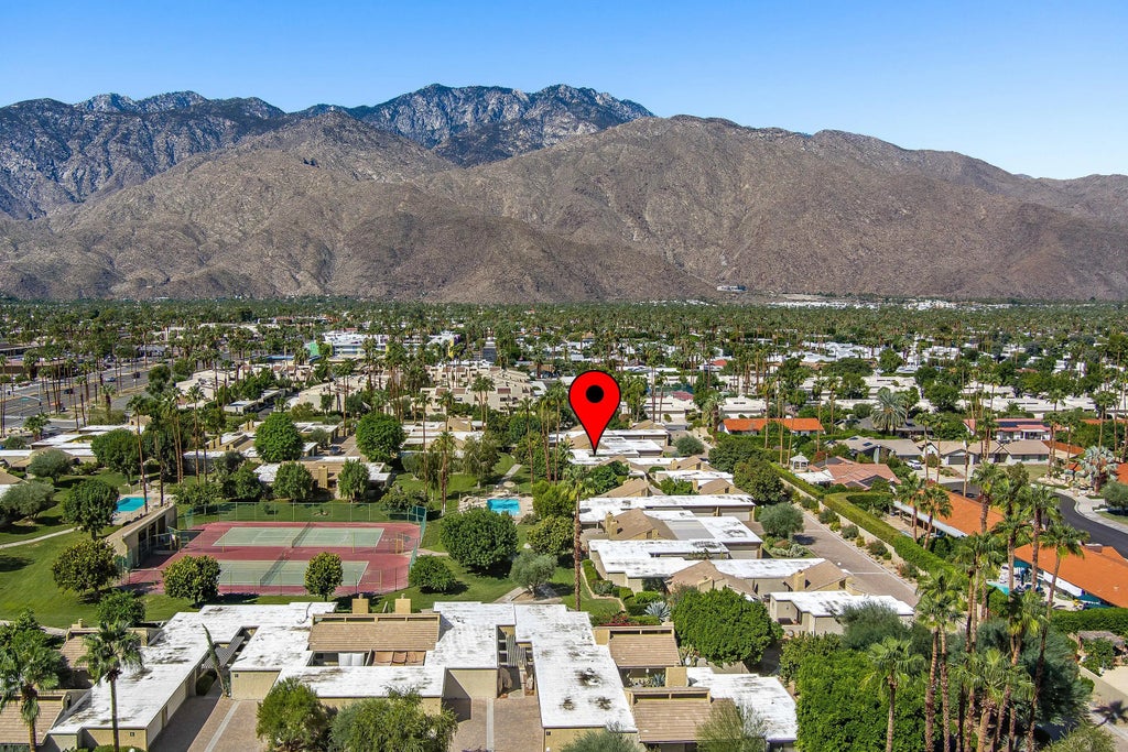 This Hugh Kaptur designed condo is a true 3 bedroom 2 bath with an attached 2 car garage. Designed around a large interior patio this unique concept allows for in-home outside entertaining with complete privacy! Situated in one of the most desirable areas of the complex, this condo exudes a welcoming neighborhood vibe! Inside you will find an open floor plan with high vaulted ceilings and walls of glass allowing the soft flow of light throughout your main living areas. Updated kitchen with a large island, high end appliances and tons of cabinet space. A neutral style tile is continuous throughout the entire home that engenders an expansive flow from room to room. The spacious Primary Suite with room for a cozy sitting area with direct access to your outdoor patio. Primary bathroom has a double vanity and walk-in shower. Two guest bedrooms are on the opposite side of the home that share a central bathroom. There is a 2nd large patio that is perfect for morning coffee or basking in the desert sun. Saddlerock Gardens is a boutique complex of 43 patio homes with 2 pool/spas and 2 tennis courts. Low HOA that covers building, grounds and cable tv. Worryfree style living that is walking distance to restaurants, shopping and coffee houses.