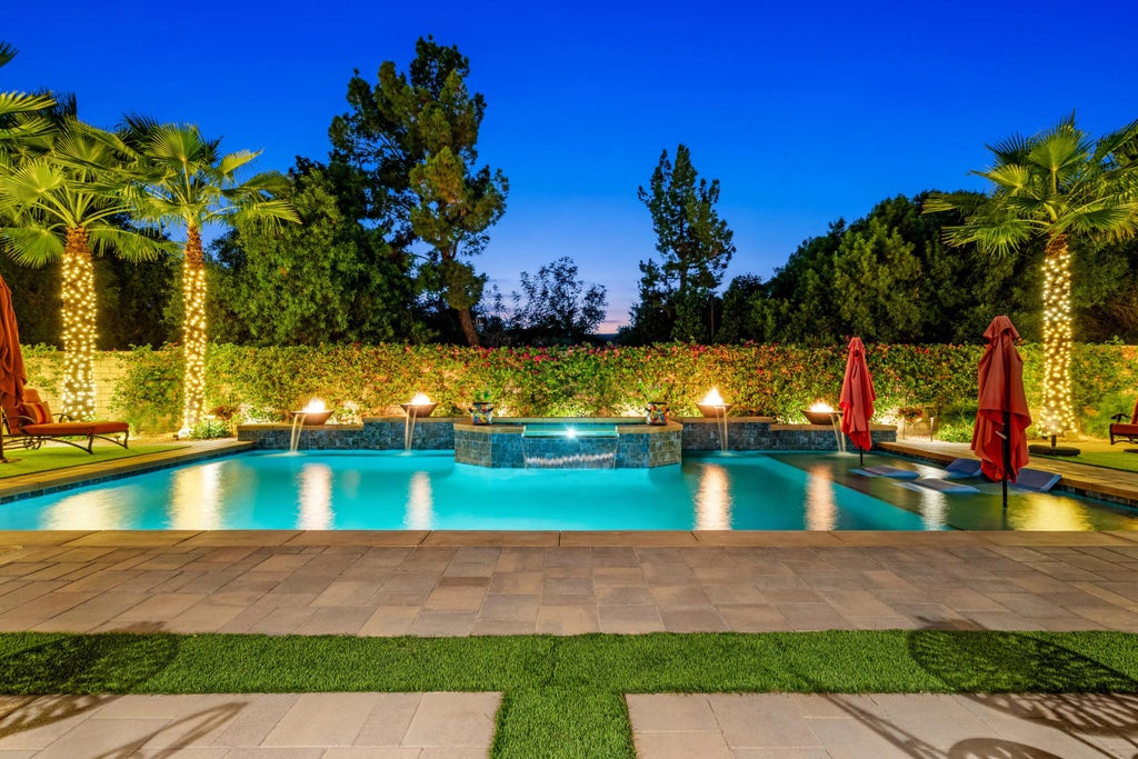 Experience resort-style living in this exquisitely upgraded 4 bed 3.5 bath 2,911 SF home with a private casita on a ¼-acre lot—where sophistication meets comfort. Enter through a custom front gate and glass door to soaring ceilings and sunlit spaces that flow seamlessly from the grand entry to the den and formal dining room. The open-concept living area boasts a custom entertainment center and modern fireplace, framed by new flooring, baseboards, and elegant crown molding throughout. The gourmet kitchen features granite counters, a chic LED-lit backsplash, pull-out cabinets, soft-close drawers, a walk-in pantry and a spacious eat-in island with breakfast nook. Down the hall are two generous guest rooms, while the casita offers its own entrance and the lavish primary suite overlooks the newly landscaped backyard retreat. Step outside to your custom designed luxurious oasis—complete with a covered outdoor kitchen and bar, lush landscaping with palms, pavers & vibrant turf, and a resort-style pool accented by fire-and-ice bowls and a custom fire pit. Every detail, from the high-tech security and misting system to the refined finishes, creates a sanctuary of luxury, technology and timeless beauty within the gated community of Carmela. This home is move-in ready & ready to impress.