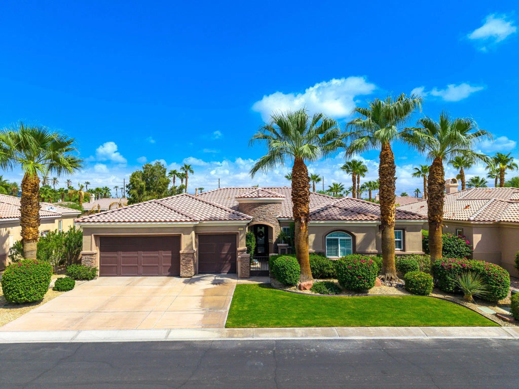 The tour begins with an enclosed ,gated courtyard complete with a custom, lighted, rain fountain in a river rock garden surrounded by lush, flowering landscaping. Upon entering this lovely home you will first notice the office with it's double doors, professionally designed and installed bookcases, cabinets and 2 desk island topped with leather granite. Next you will notice the beautiful easy-care wood floors, plantation shutters and crown molding. Beyond the foyer you will see a formal dining room with a crystal chandelier and a formal living room or conversation area. Leading to the kitchen is a full wet bar with a wine refrigerator and leather granite counter, (FYI) leather granite is more expensive and tougher than most granites plus more unique. Next is the large kitchen which offers stainless steel appliances, a walk-in pantry, high end cabinets and a large island with leather granite countertops. Beyond the kitchen area is a built-in desk, breakfast room and family room with a gas fireplace. The three bedrooms are on the opposite wing of the house and each has a customized walk-in closet and ensuite. The powder room has Italian plastered walls and a chandelier. The 3 car garage has lots of professionally installed storage cabinets, air conditioning, a Central Vac system, and a whole house water purification system. As we exit to the backyard we are greeted with Paradise!! A large covered patio, then a fabulous custom pool and spa with waterfall and fire bowls. We also see a custom flagstone fire pit and a large BBQ island and bar with a flagstone facade and granite counters. Adding to this ambiance is surround sound speakers and lush landscaping. Also there is privacy with no homes behind it and on a green belt! Finally the HOA dues are low. We invite you to experience beautiful La Quinta where there are restaurants, golf courses, tennis courts ,polo and Old Town. Call to arrange an appointment to see this lovely home before it's gone!