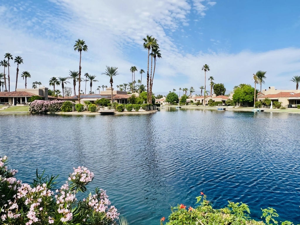Nestled within the heart of Lake Mirage, this beautifully updated 3-bedroom, 3-bath residence combines comfort, elegance, and resort-style living. Step inside to a light-filled, open floor plan featuring tile and wood-look flooring throughout, classic wood shutters, and soaring cathedral ceilings. A double-sided fireplace warms both the living and dining areas, creating an inviting atmosphere for relaxing or entertaining. Expansive windows frame panoramic views of the lake and surrounding mountains, while the spacious patio invites you to enjoy tranquil mornings or sunset gatherings by the water. The primary suite offers peaceful lake views, a generous walk-in closet, and a luxurious ensuite bath complete with jetted tub and separate shower. Each bedroom features direct access to its own bathroom, ensuring privacy and convenience for all. This highly desired floor plan offers the ease of single-level living—no interior steps—and includes an assigned dock, perfect for a small electric boat or kayak. Located within the prestigious Lake Mirage Racquet Club, residents enjoy world-class amenities including 25 acres of open lake for sailing and rowing, scenic jogging and cycling paths, 10 tennis courts, 2 pickleball courts, 11 pools and spas, a fitness center, and a clubhouse ideal for private gatherings. All set within a guard-gated community just minutes from premier shopping, fine dining, and top-rated healthcare in the heart of Rancho Mirage.