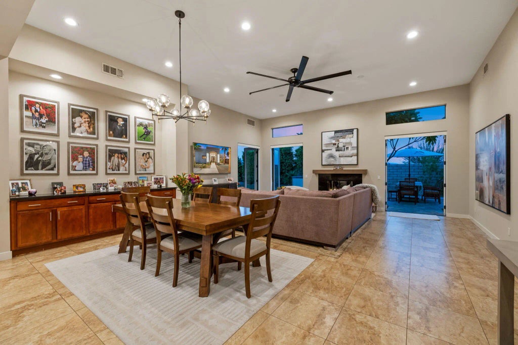 The open-concept living area centers around a dramatic great room with a statement fan and a stunning chandelier over the dining space. The chef's kitchen showcases granite slab counters, a custom backsplash, Bosch stainless-steel appliances, a pantry, dual sinks, and a mini wine fridge—ideal for entertaining.